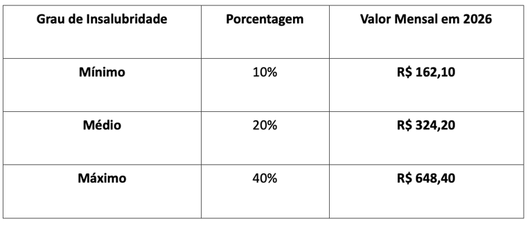 Com o novo salário mínimo fixado em R$1.621,00 a partir de janeiro de 2026, os valores do adicional também foram reajustados. O cálculo é feito com base em uma porcentagem sobre o salário mínimo, dependendo do grau de exposição. Confira a tabela no final deste post.